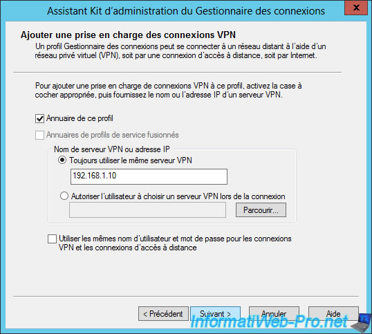 Cochez la case "Annuaire de profil" et indiquez l'adresse IP externe de votre serveur VPN dans la case "Toujours utiliser le même serveur VPN".