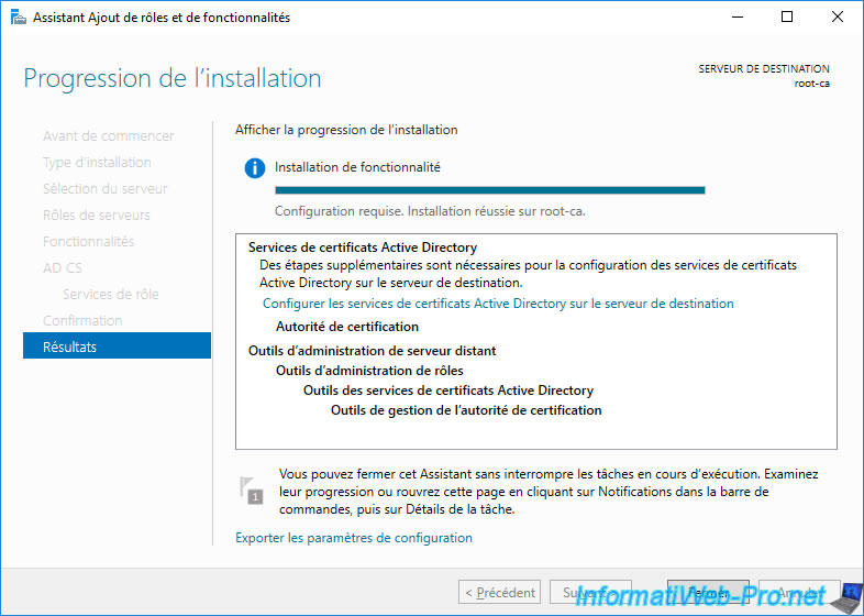 Pour cela, dans l'assistant d'ajout de rôles et de fonctionnalités du serveur "root-ca", cliquez sur le lien affiché : Configurer les services de certificats Active Directory sur le serveur de destination.