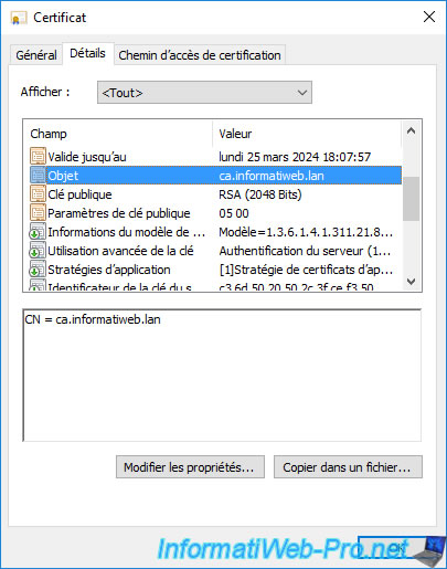 Dans l'onglet "Détails", si vous sélectionnez le champ "Objet", vous verrez que le nom commun (CN) correspond au nom de domaine du serveur où est installée l'interface web de votre autorité de certification.