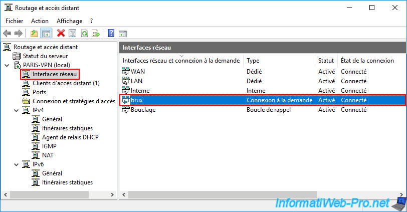 Ensuite, assurez-vous que la connexion à la demande "bruxelles" sur le serveur VPN de Paris est en état "Connecté".