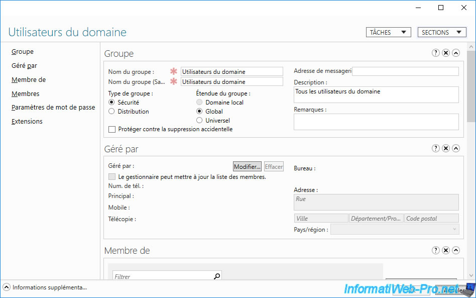 Tout en bas des propriétés, vous trouverez une section "Extensions" qui correspond à chaque fois aux anciens onglets qui étaient disponibles dans l'ancienne console : Utilisateurs et ordinateurs Active Directory.