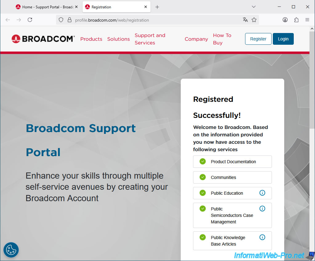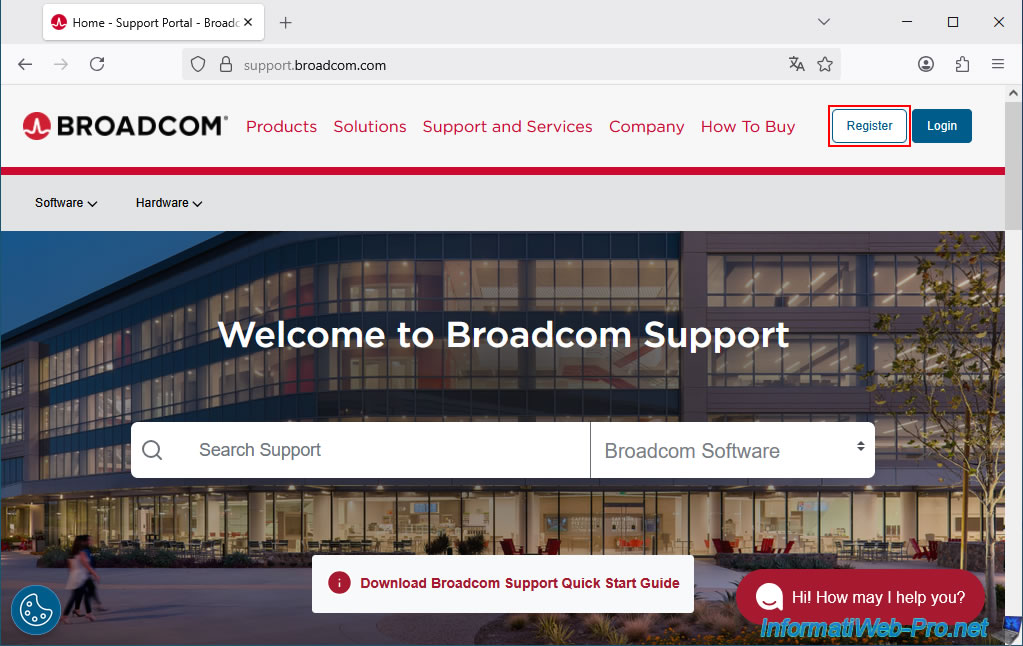 Pour cela, accédez au site "Home - Support Portal - Broadcom support portal" et cliquez sur le bouton "Register" (en haut à droite de la page).