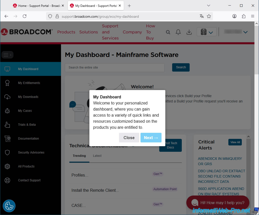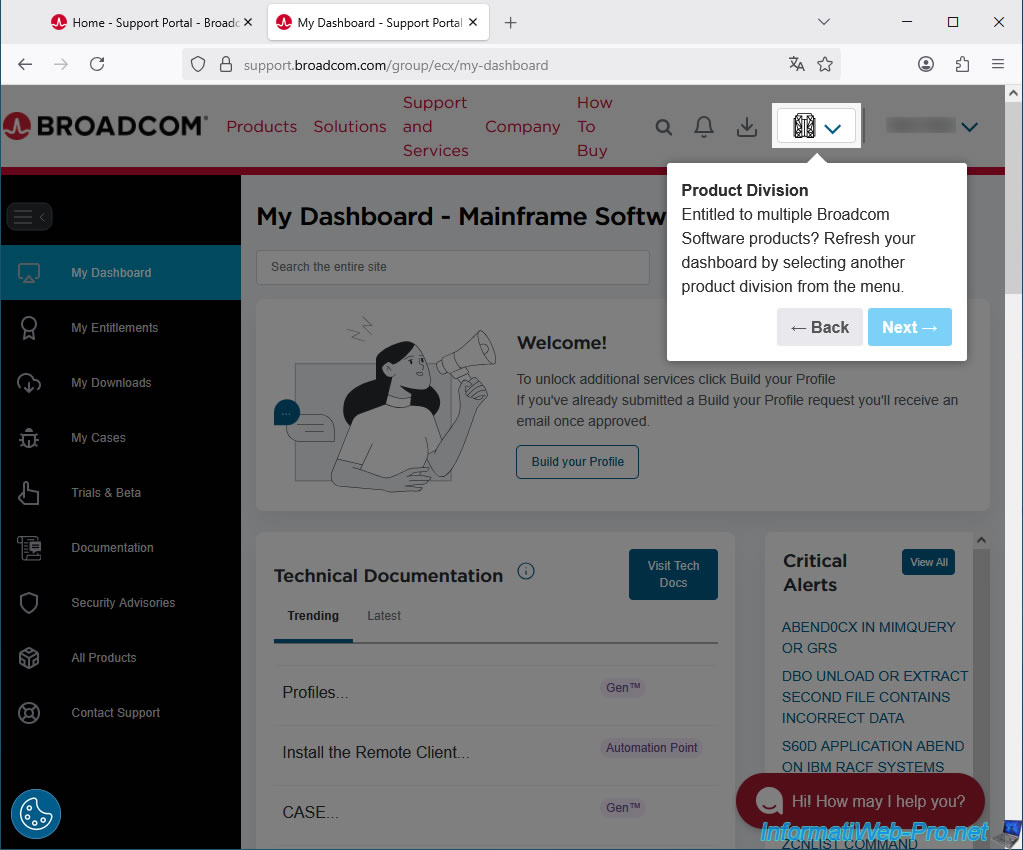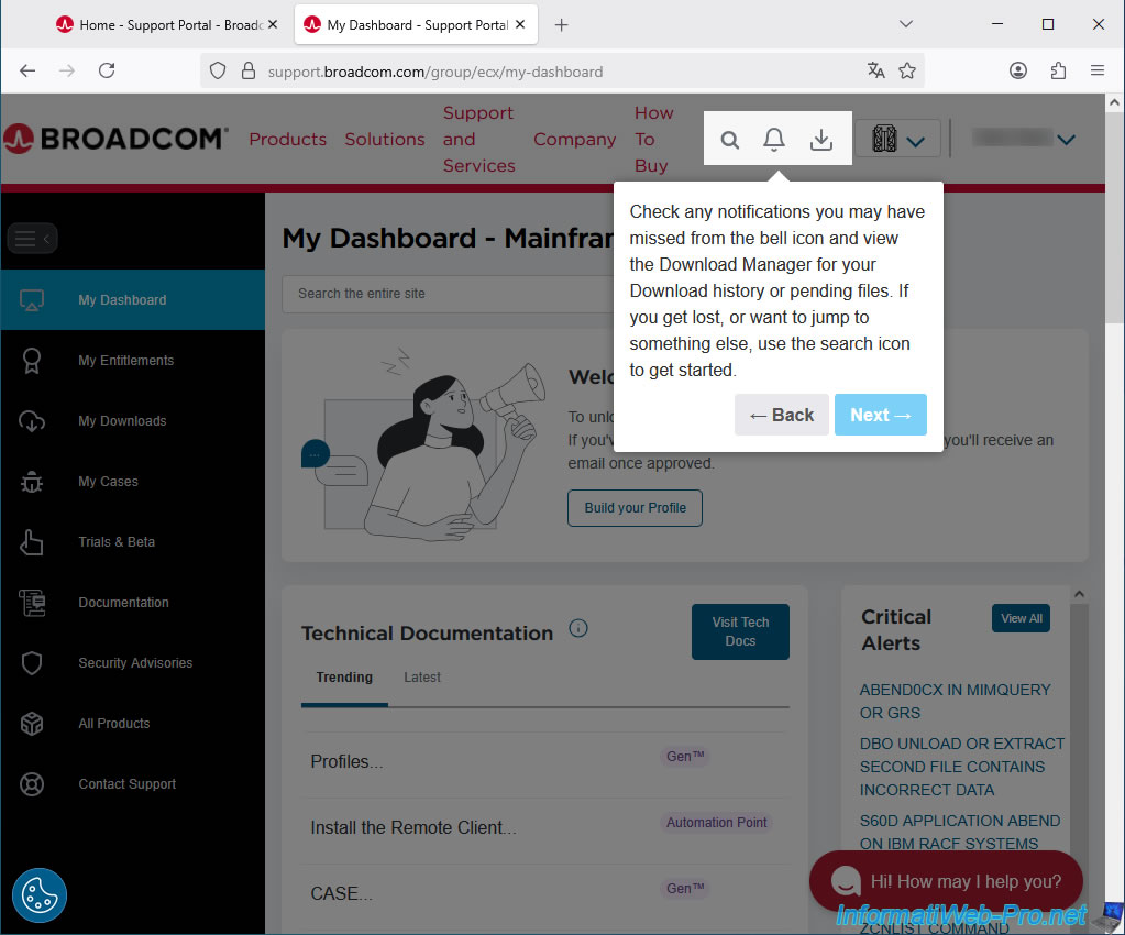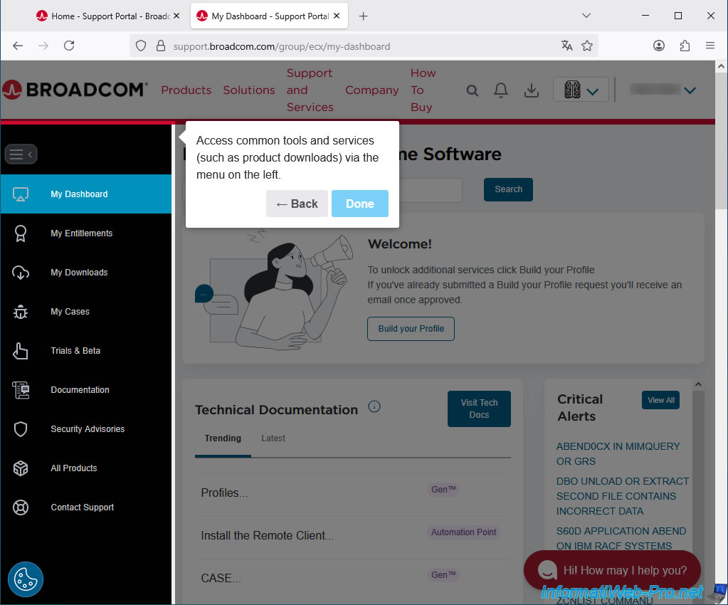 A votre 1ère connexion sur le support de Broadcom, un petit tutoriel interactif apparaitra.