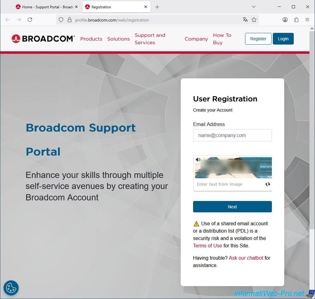 Attention : comme vous pouvez le voir ci-dessous, si vous avez utilisé une adresse e-mail personnelle (donc d'un service gratuit comme Hotmail, Outlook, Gmail, ...), Broadcom vous refusera l'accès à ces services supplémentaires.
