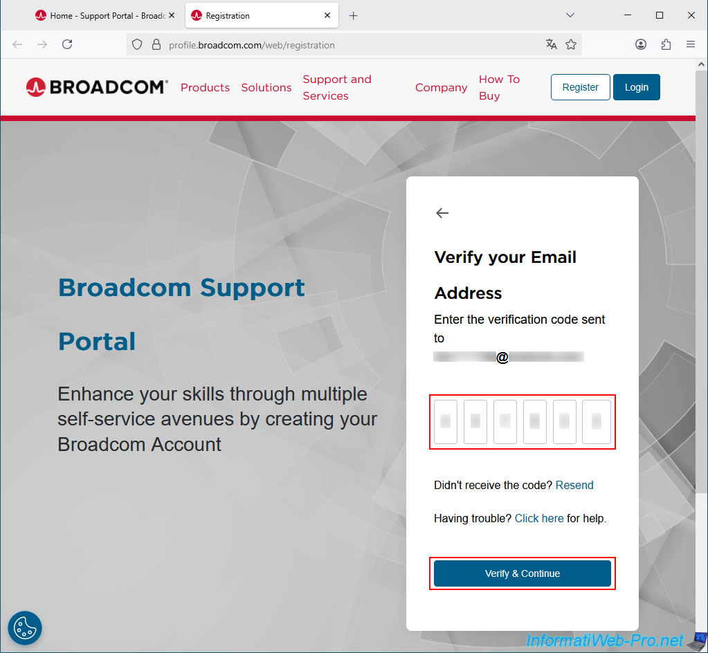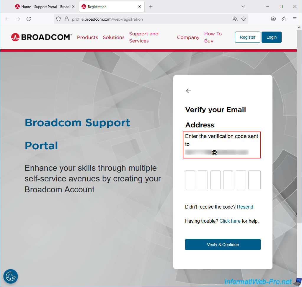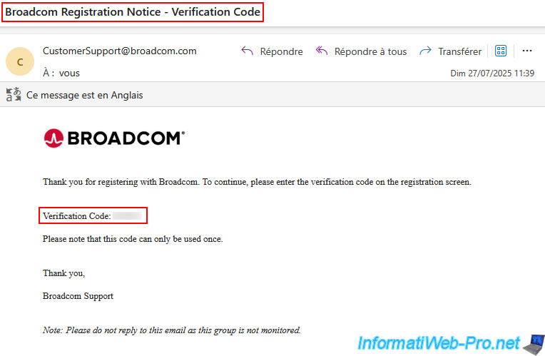 Sur votre adresse e-mail, vous devriez recevoir un e-mail "Broadcom Registration Notice - Verification Code".