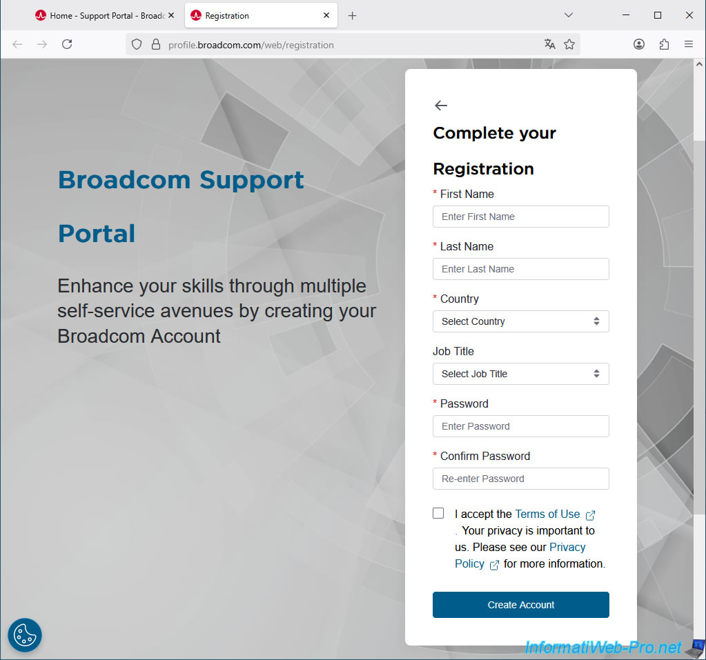 Ensuite, vous devrez indiquer quelques informations personnelles (la donnée la plus utile étant le pays), ainsi qu'un mot de passe sécurisé (qui respecte les nombreux pré-requis que Broadcom vous affichera lorsque vous taperez celui-ci).