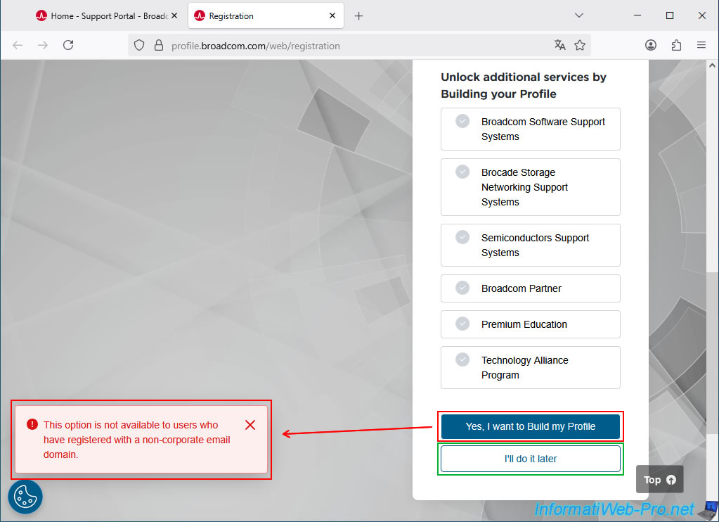En effet, lorsque vous cliquerez sur le bouton "Yes, I want to Build my Profile", le message d'erreur "This option is not available to users who have registered with a non-corporate email domain".