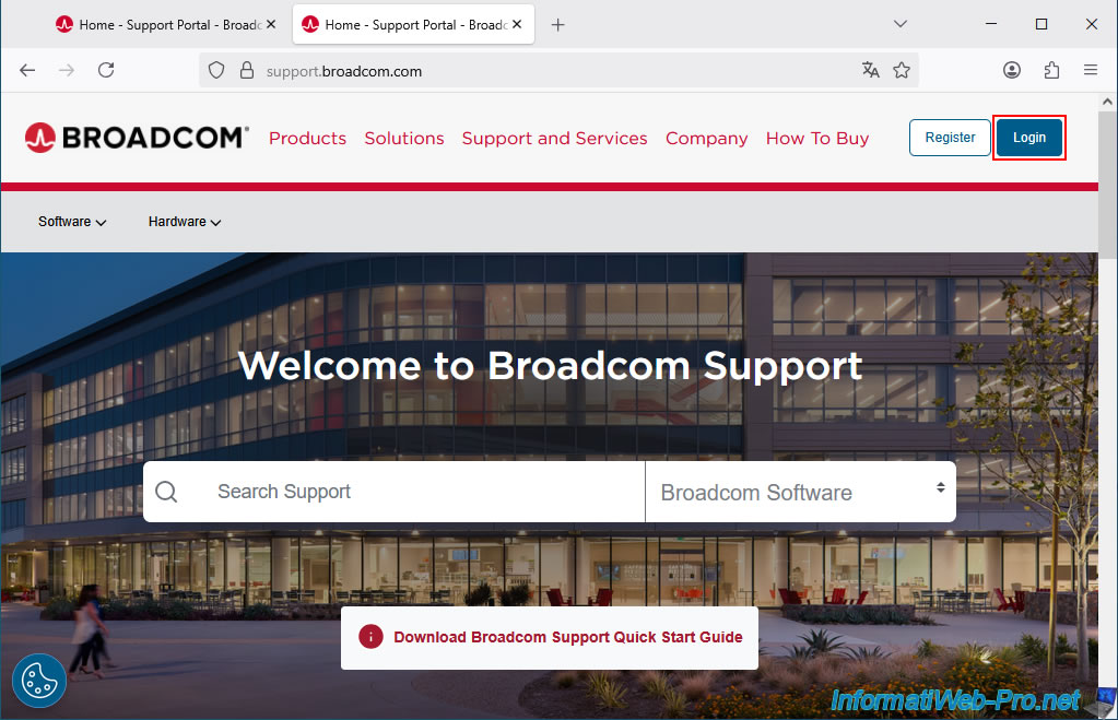 Pour vous connecter sur le site du support de Broadcom, cliquez simplement sur le bouton "Login" situé en haut à droite.