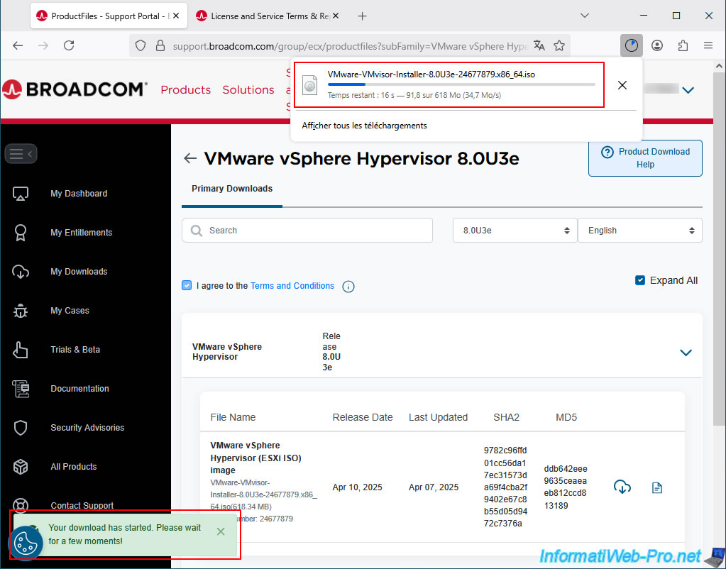 Le téléchargement du fichier "VMware-VMvisor-Installer-8.0U3e-241677879.86_x64.iso" démarre et le message "Your download has started. Please wait a few moments" apparaitra.