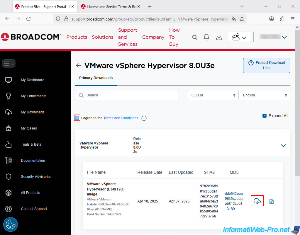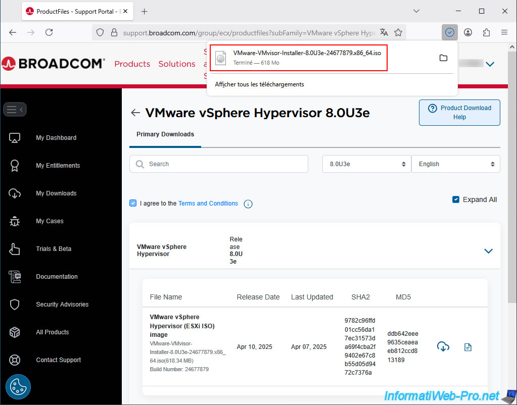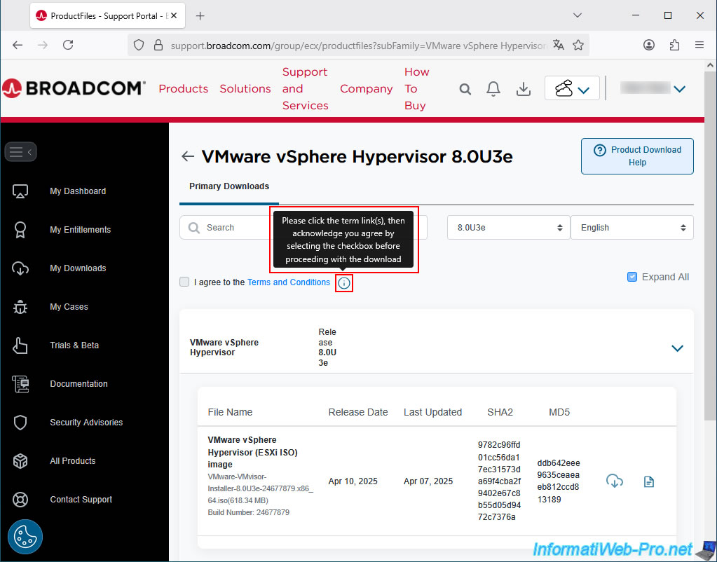 Avant de télécharger le fichier ISO de VMware vSphere Hypervisor (VMware ESXi), vous devrez accepter les conditions d'utilisation du support de Broadcom.