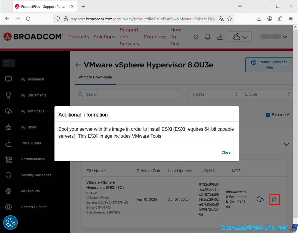 Si vous cliquez sur l'icône représentant un fichier (située à droite de l'icône de téléchargement), Broadcom vous indiquera simplement que vous devez démarrer votre serveur sur cette image (ISO) pour installer VMware ESXi et que VMware ESXi requiert un processeur 64 bits.