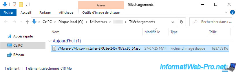Comme prévu, nous avons le fichier "VMware-VMvisor-Installer-8.0U3e-241677879.86_x64.iso" sur notre disque dur.