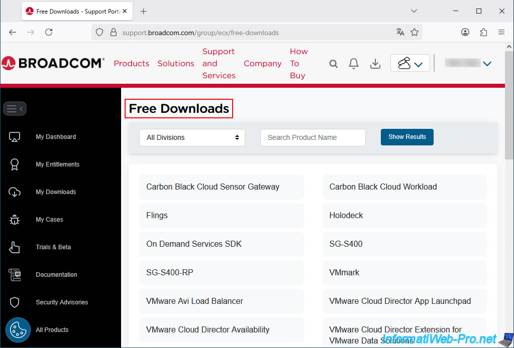 Pour commencer, connectez-vous avec votre compte Broadcom (un compte gratuit suffit) sur le site du support de Broadcom.
