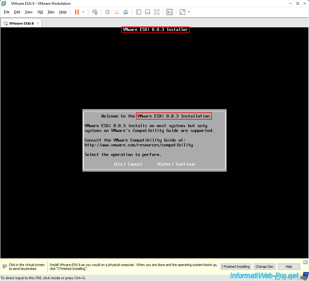 Votre ordinateur ou serveur démarre sur le programme d'installation de VMware ESXi 8.0.3.