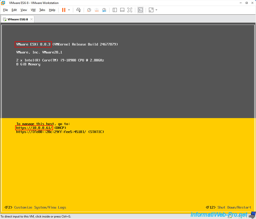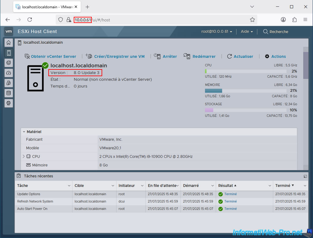 Si nous accédons à l'adresse IP de notre serveur "VMware ESXi 8.0.3" visible ci-dessus, nous pouvons voir ci-dessous qu'il s'agit bien de la version "8.0 Update 3".