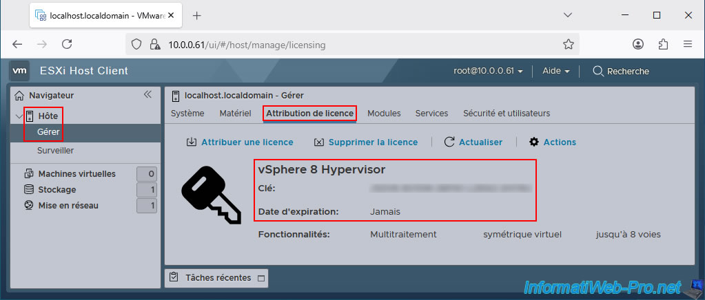 Si vous allez dans le menu "Hôte -> Gérer -> Attribution de licence", vous verrez qu'il y déjà une licence sans date d'expiration qui est encodée sur votre serveur VMware ESXi 8.