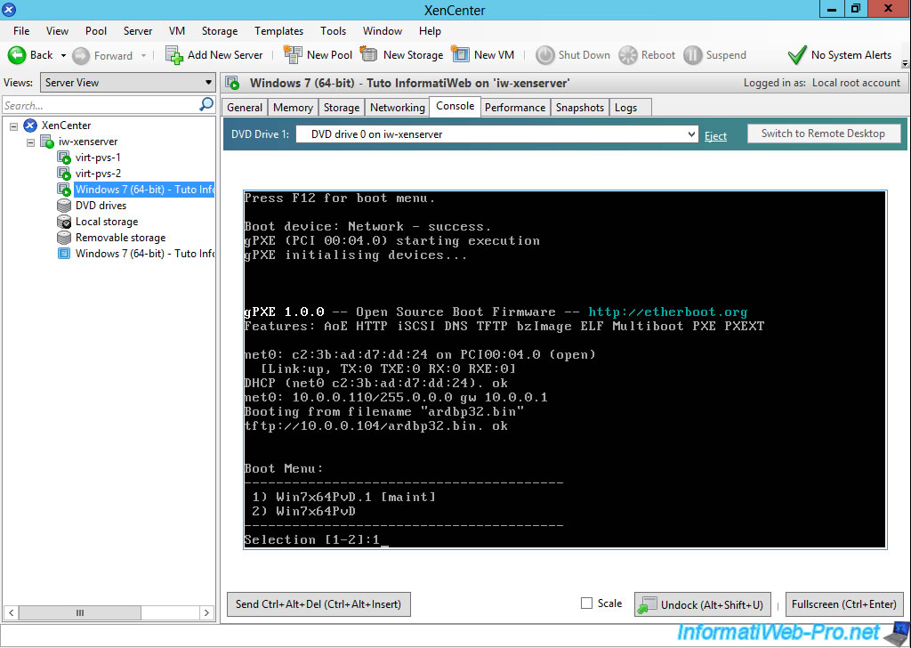Démarrez votre machine virtuelle de référence via XenCenter et choisissez la version "test".