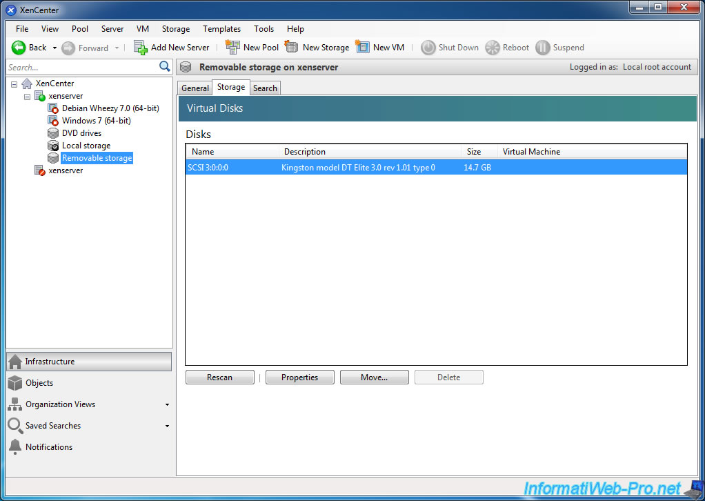 Si vous jetez un oeil dans le stockage disponible sur votre serveur XenServer, vous verrez que votre clé USB est utilisée par la machine virtuelle à laquelle vous l'avez associée précédemment.