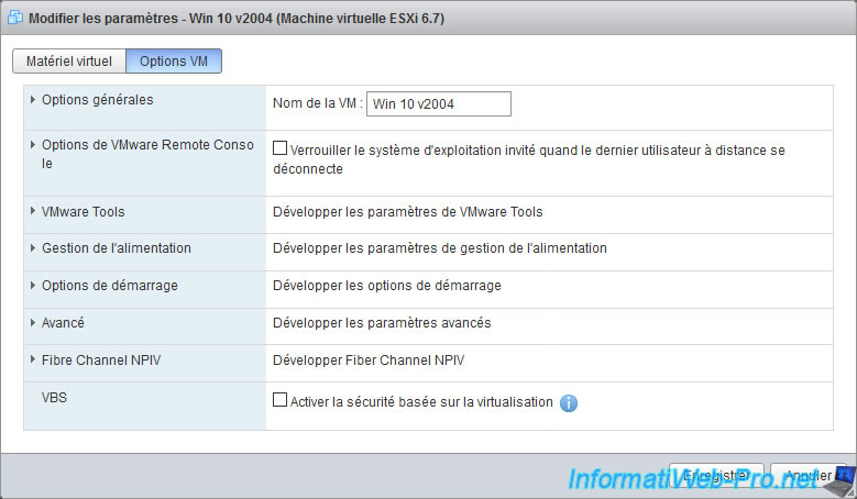 Dans l'onglet "Options VM", vous pourrez gérer les options et les paramètres de votre machine virtuelle.