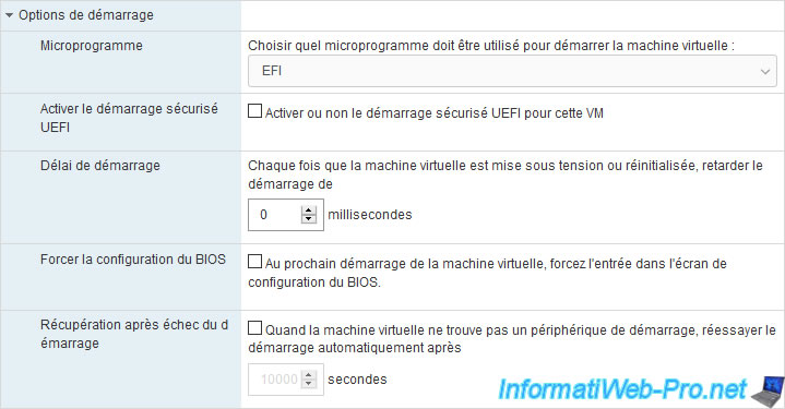 Dans la section "Options de démarrage" des options VM, vous pourrez :