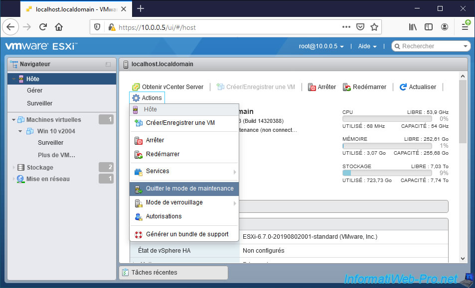 Pour cela, dans "Hôte", cliquez sur "Actions -> Quitter le mode de maintenance".