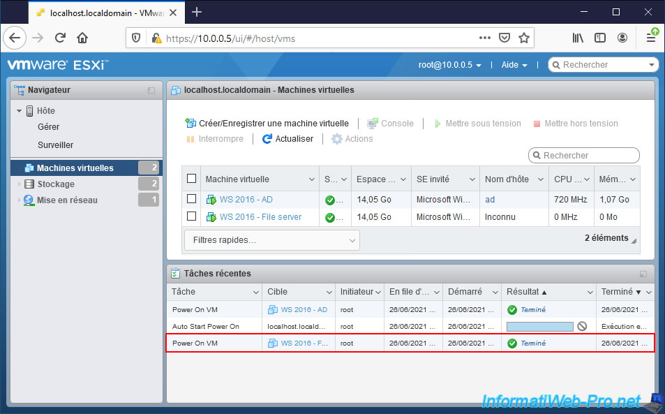 Une 2ème tâche "Power On VM" apparait donc dans les tâches récentes et notre 2ème machine virtuelle (WS 2016 - File server) démarre.