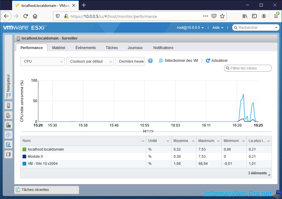 Dans l'onglet "Performance", vous pourrez surveiller l'utilisation des ressources système (CPU, mémoire, réseau et disque) de votre hyperviseur sur la dernière heure.