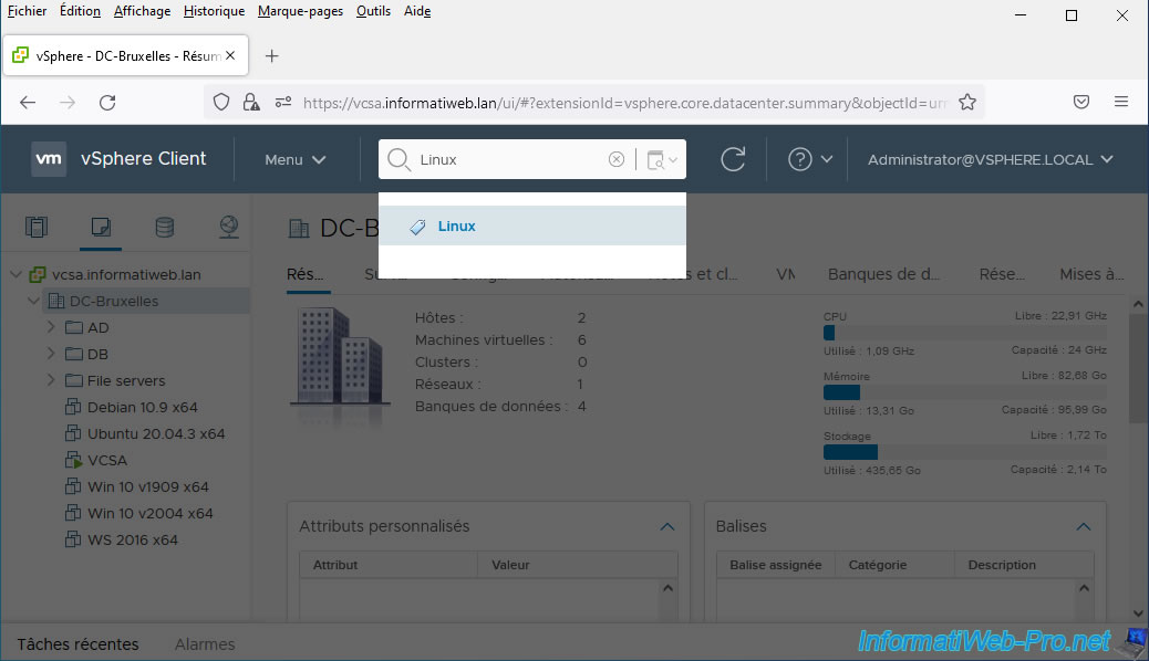 Grâce à VMware vCenter Server (VCSA), vous pourrez aussi regrouper certaines machines virtuelles entre-elles dans des dossiers ou utiliser des balises (pour les retrouver plus facilement).