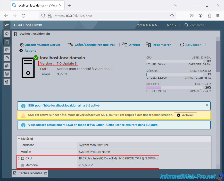 Note : il est normal que cette alerte s'affiche la 1ère fois que vous vous connectez à votre hyperviseur VMware ESXi.