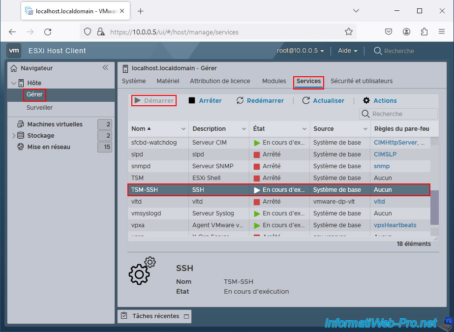 Ensuite, allez dans "Hôte -> Gérer -> Services" et démarrez le service "TSM-SSH".