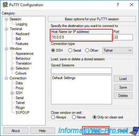 Téléchargez "PuTTY" comme client SSH, indiquez l'adresse IP de votre hyperviseur VMware ESXi 7.0.3 et cliquez sur : Open.