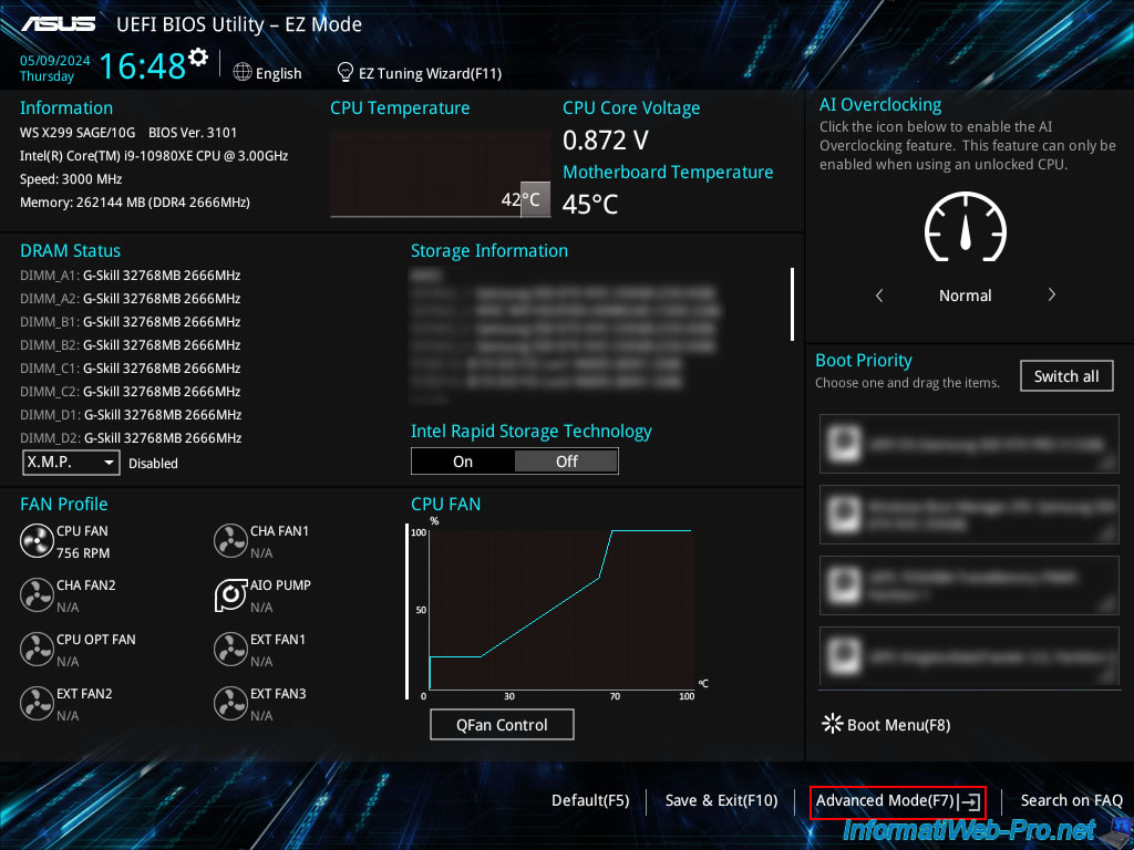 Appuyez sur la touche "Suppr" ou "Del" pour rentrer dans le BIOS / firmware UEFI de votre carte mère et allez dans le mode avancé.