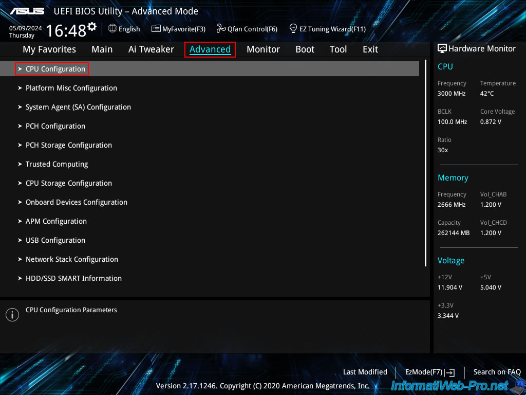 Dans le cas d'une carte mère ASUS, allez dans l'onglet "Advanced", puis cliquez sur : CPU Configuration.