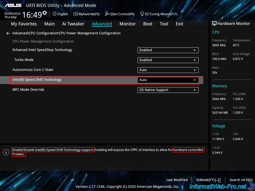 Dans cette section "CPU Power Management Configuration", si vous sélectionnez l'option "Intel(R) Speed Shift Technology", vous verrez que cette option permet d'activer ou de désactiver le support de la technologie "Intel(R) Speed Shift".