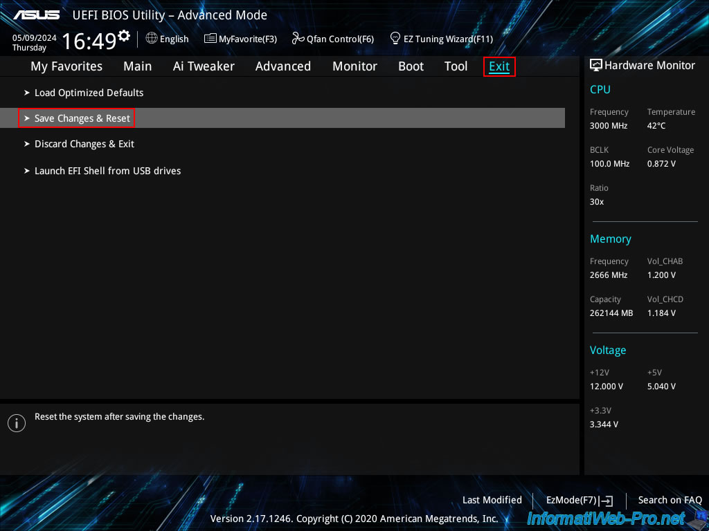 Maintenant, allez dans l'onglet "Exit" et cliquez sur : Save Changes & Reset.