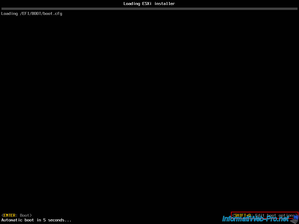Démarrez votre ordinateur ou votre mini PC sur le CD d'installation de VMware ESXi 7 et appuyez sur "SHIFT + O" avant que le timer de 5 secondes n'arrive à 0.