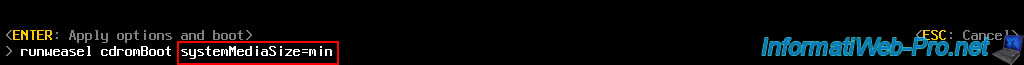 Notez que vous pourriez aussi ajouter l'option "systemMediaSize=min" dans le fichier "boot.cfg" présent à la racine du fichier ISO et présent également dans le dossier "EFI\boot" de ce même fichier ISO.