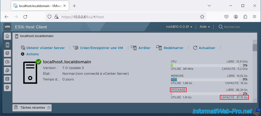 Comme vous pouvez le voir, VMware ESXi 7 nous indique que notre espace de stockage est de 87,75 Go.