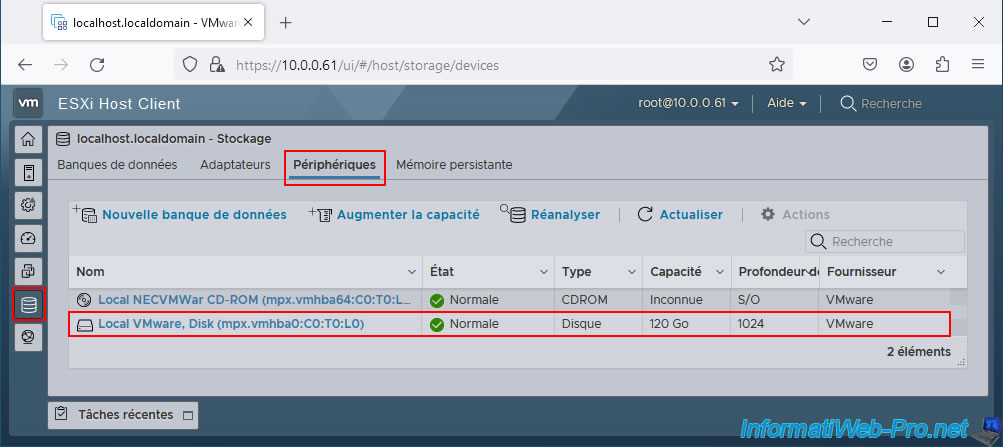 Or, en allant dans la section "Stockage -> Périphériques", on peut voir que la capacité de notre disque est bien de 120 Go.