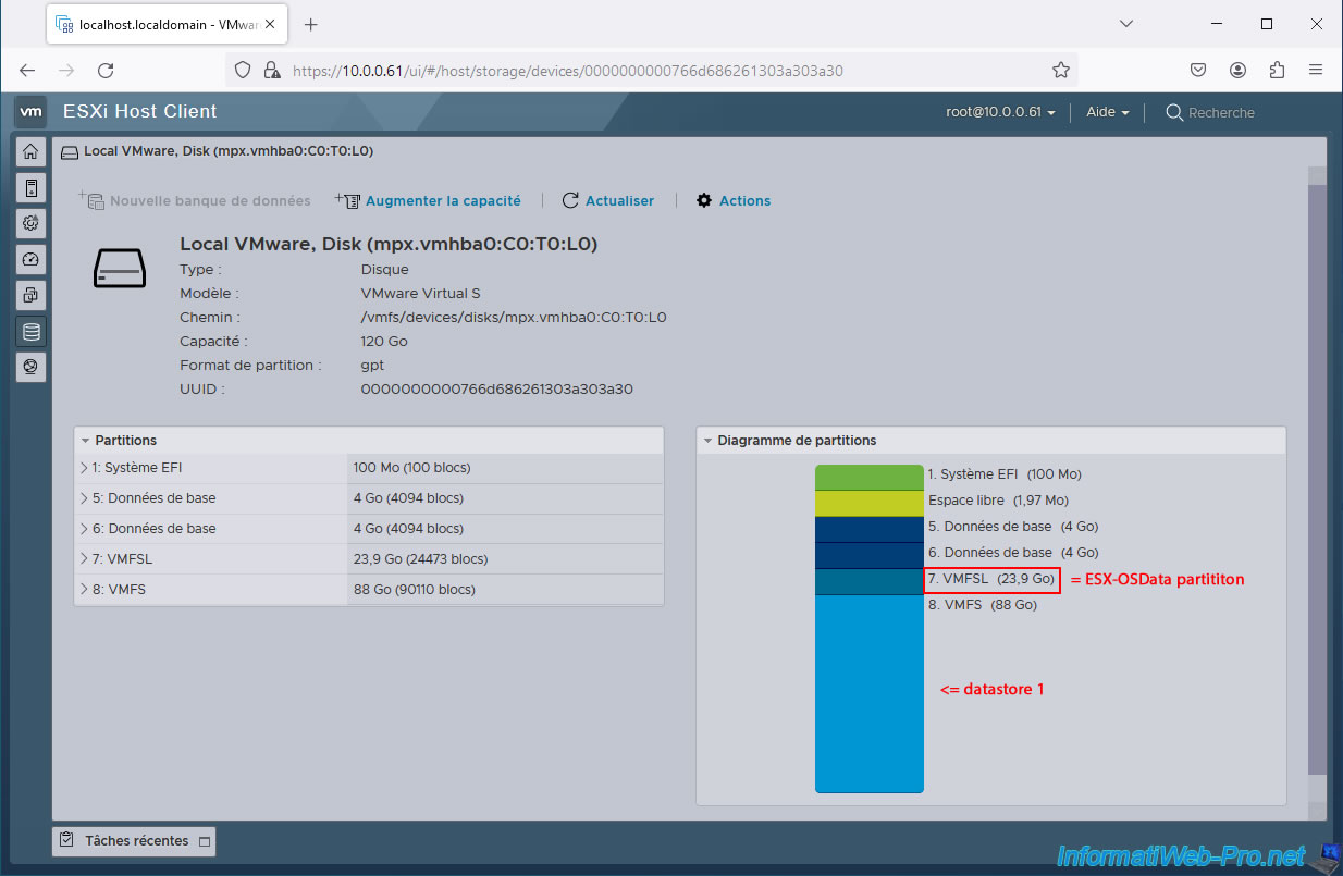 Si on clique sur le nom de notre disque de 120 Go, on peut voir que la partition VMFSL (qui correspond à la nouvelle partition "ESX-OSData" de VMware ESXi 7) a une taille d'environ 24 Go.