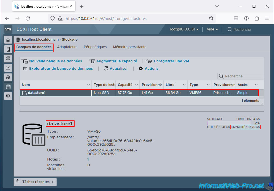 D'ailleurs, en allant dans "Stockage -> Banques de données", on peut voir que notre banque de données "datastore1" a une capacité d'environ 88 Go.