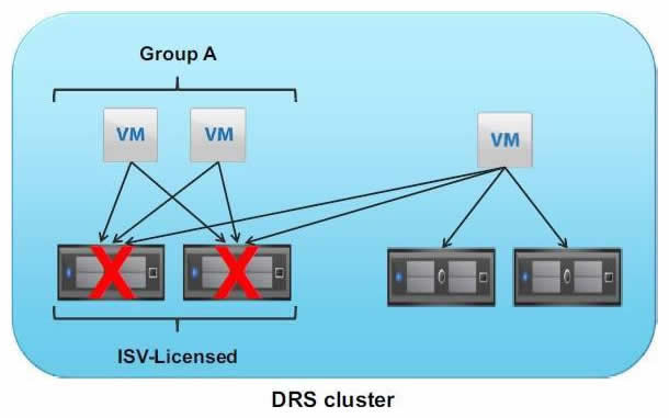 Dans ce 2ème exemple, vous indiquez à DRS que les machines virtuelles du groupe A doivent s'exécuter uniquement sur le groupe d'hôtes "ISV-Licensed".