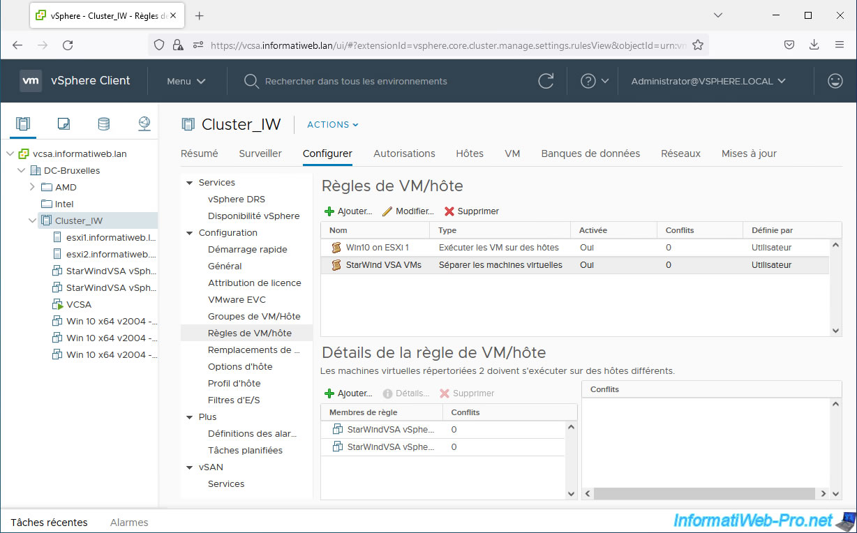 Pour que le stockage StarWind Virtual SAN soit toujours disponible, même en cas de panne d'un de nos hôtes, nous sélectionnons notre cluster VMware vSphere et nous allons dans : Configurer -> Configuration -> Règles de VM/hôte.
