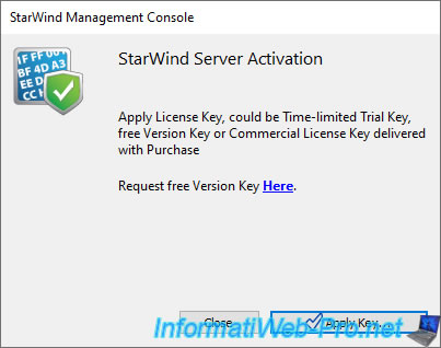 La 1ère fois que vous vous connectez à votre machine virtuelle StarWind Virtual SAN depuis la StarWind Management Console, une fenêtre "StarWind Server Activation" apparaitra.
