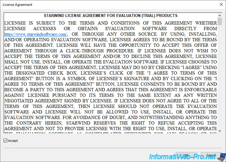 Acceptez le contrat de licence de StarWind en cochant la case "Accept", puis en cliquant sur OK.