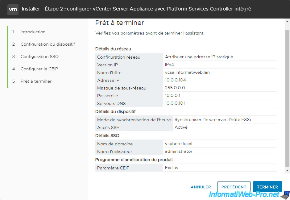 Un résumé de la configuration de votre machine virtuelle VCSA apparait.