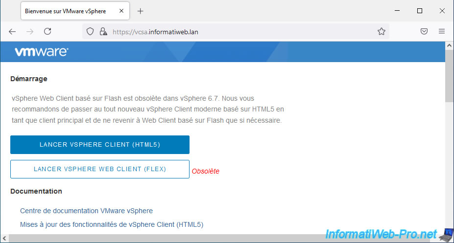 Pour vous connecter à celui-ci, accédez à l'adresse : https://vcsa.informatiweb.lan:443