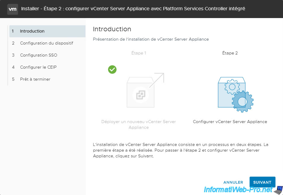 L'assistant "Installer - Etape 2 : configurer vCenter Server Appliance avec Platform Services Controller intégré" qui s'affiche, cliquez sur Suivant.