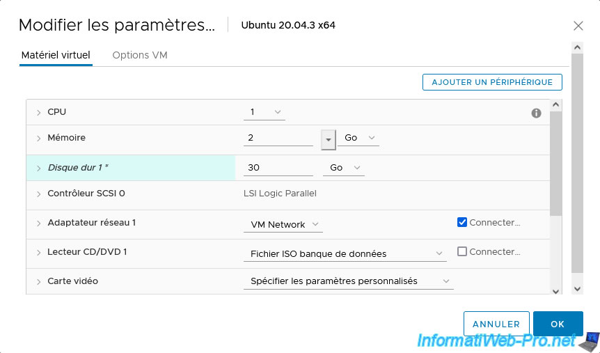 Dans notre cas, nous avons indiqué "30 Go" au lieu de "20 Go".