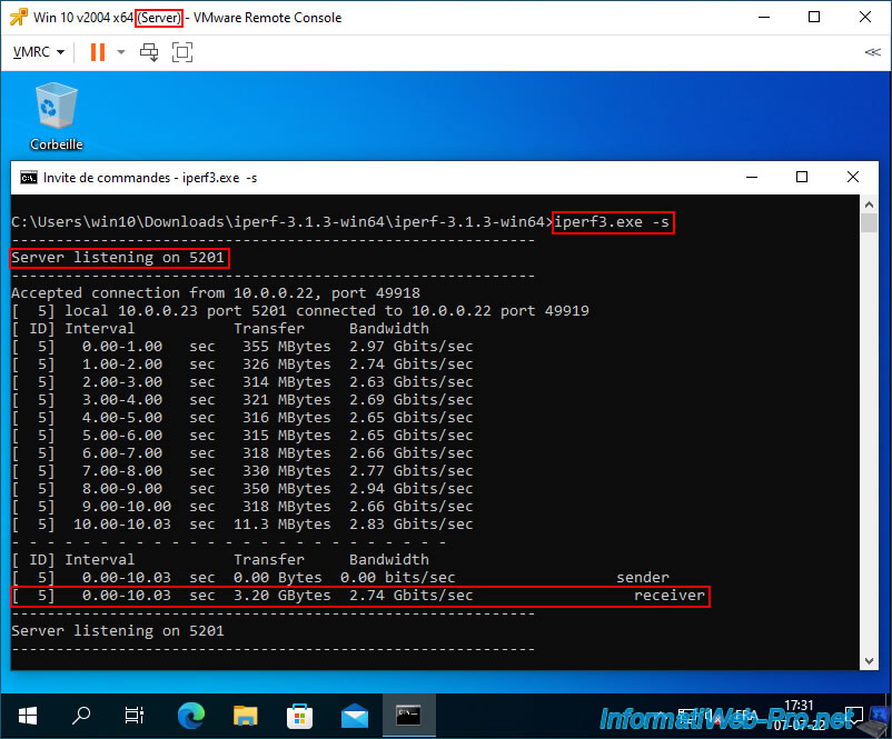 Sur la machine virtuelle "Win 10 v2004 x64 (Server)", lancez "iPerf" en tant que serveur grâce à la commande :